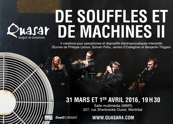 On the heels of their recent North American tour, which took the musical ensemble from Newfoundland to San Francisco by way of Saint-Pierre-et-Miquelon, the Quasar Saxophone Quartet will continue their exploration of the sonic world in the digital era with their presentation of De souffles et de machines II, a program of four works for interactive electroacoustic devices. This concert is presented as part of Quasar's Electro Series, now in its 6th edition. Since its debut in 2003, the Electro Series has helped raise Montreal's profile as a focal point of avant-garde music. When Quasar teams up with electronics, it's always a highly anticipated event, one that promises to deliver the unexpected!