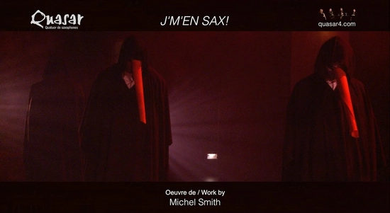 By collaborating with composer Michel Smith, who has worked for twenty-five years in the theater and multidisciplinary fields, Quasar wanted to bring the public on a new ground at the intersection of music, happening and theater. After Carrefour sax I and II, which related in a form of ambulatory, 20 years of the quartet's history, J'm'en SAX ! is looking to the future, or even to another place ...